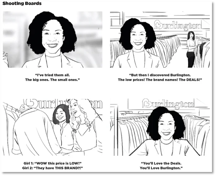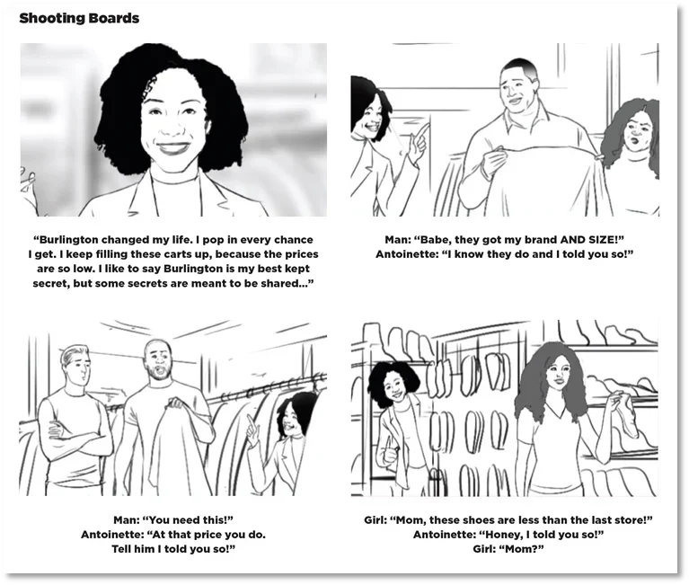 Once she has created momentum for Burlington, our last commercial is where we finally see other customers following suit by finding deals, amazing brands, and all the items they cannot believe we have in-store. However, our lady is still around telling everyone she told them so. She takes the credit because she is an extension of Burlington. She goes from the voice of the brand to the voice inside your head. These commercials will get the word out and cement the fact that Burlington has low prices on great brands and an amazing selection of items to boot. Why? Because I told you so!